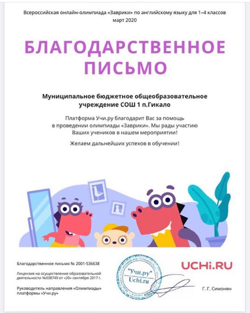Благодарственные письма Учи.ру