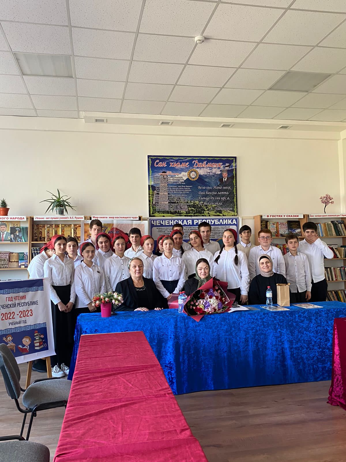 Мероприятия направленны на поднятие интереса подрастающего поколения к чтению, повышение статуса книги и чтения среди детей и подростков, развитие читательской грамотности, расширение знаний о родном крае и культуре. Одно из таких мероприятий 27 октября провела заведующая школьной библиотеки Тесаева Луиза Мовлдиевна. Была организована встреча активистов школьной библиотеки с известной поэтессой, членом Союза писателей России, членом правления Чеченского регионального отделения Союза женщин России Дахаевой Розой Айнудиновной.