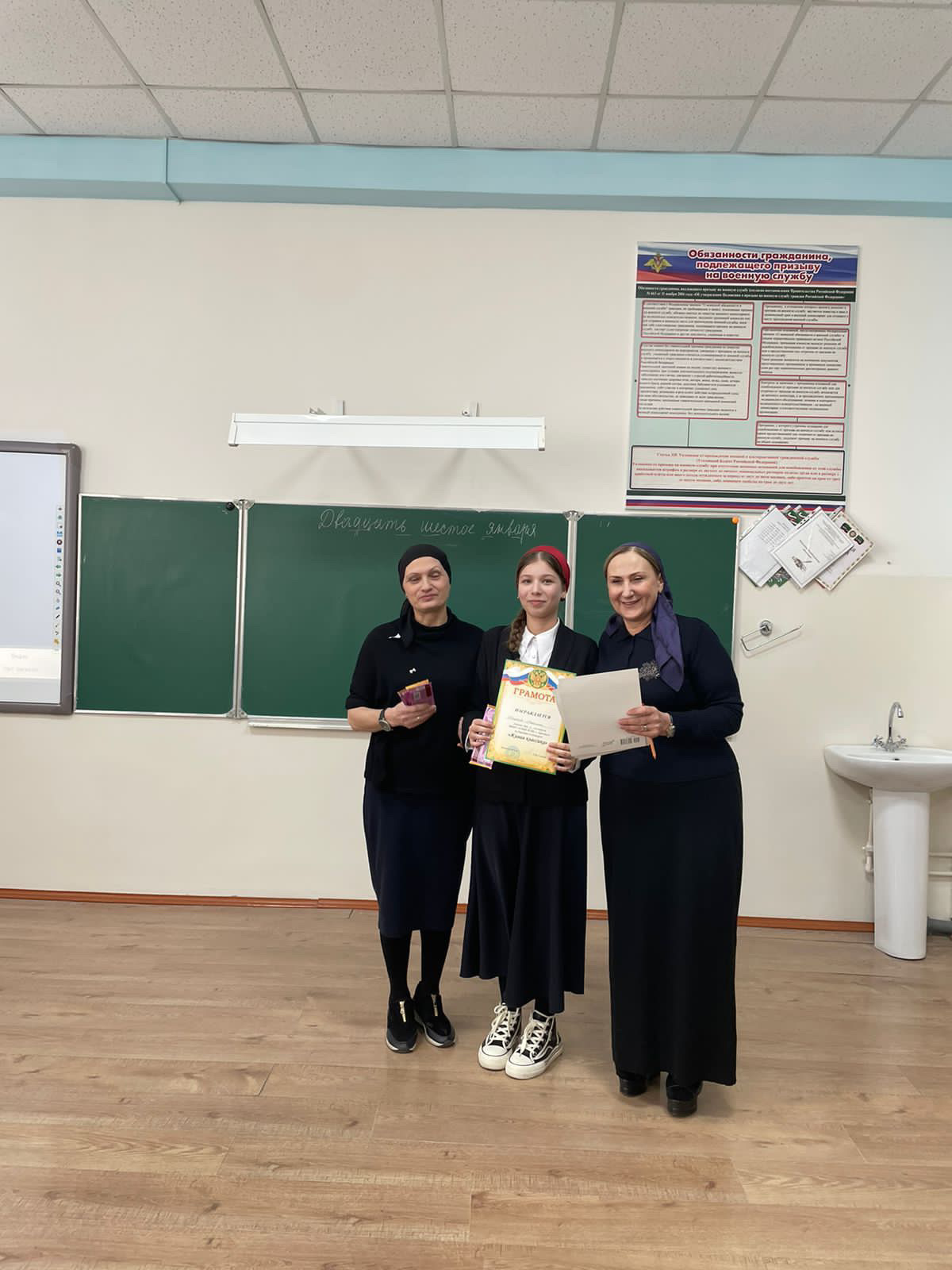 В конце мероприятия были подведены итоги конкурса: 1 место заслуженно занята ученица 7 «В» класса Курбанова Мадина, 2 место занял ученик 9 «Б» класса Магомадов Рамзан, 3 место досталось ученице 9 «А» класса Хаджиевой Асет. Лучшие чтецы были отмечены грамотами и памятными подарками.