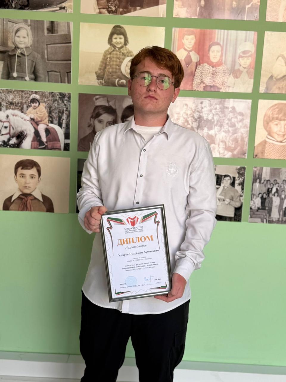 08.08.2025Ученик школы № 40 г. Грозного Умаров Сулейман награждён почётной грамотой Министерства образования Чеченской РеспубликиВ рамках национального проекта «Молодёжь и дети» ученик 10 класса школы № 40 города Грозного Умаров Сулейман был отмечен почётной грамотой от Министерства образования Чеченской Республики.Сулейман стал победителем регионального этапа Всероссийской олимпиады школьников по технологии, продемонстрировав высокий уровень знаний и творческий подход к решению сложных задач. К подготовке к региональному этапу он приступил задолго до соревнований, активно занимаясь в образовательном центре «Квант» и работая под руководством своего наставника - заместителя директора по методической работе Хаптукаевой С.Б., которая помогла раскрыть его потенциал и подготовиться к сложным испытаниям.Церемония награждения прошла на базе Лингвистической школы города Грозного. В торжественном мероприятии приняли участие представители Министерства образования, педагоги и учащиеся.«Я очень рад и горжусь этой победой. Для меня участие в олимпиаде -это не только возможность проверить свои знания, но и шанс научиться новому и развить свои способности. Особую благодарность хочу выразить своему наставнику Хаптукаевой С.Б. и образовательному центру «Квант» за поддержку и помощь в подготовке», — поделился своими впечатлениями Умаров Сулейман.Поздравляем Сулеймана с заслуженной победой и желаем дальнейших успехов в учёбе и творчестве!